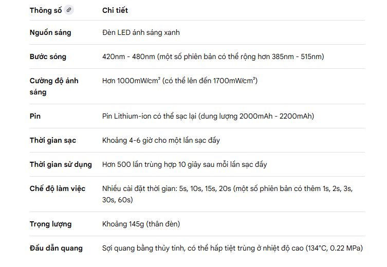 Theo các nguồn thông tin từ nhà sản xuất và nhà bán hàng, đèn quang trùng hợp Woodpecker LED B có các thông số chính sau: